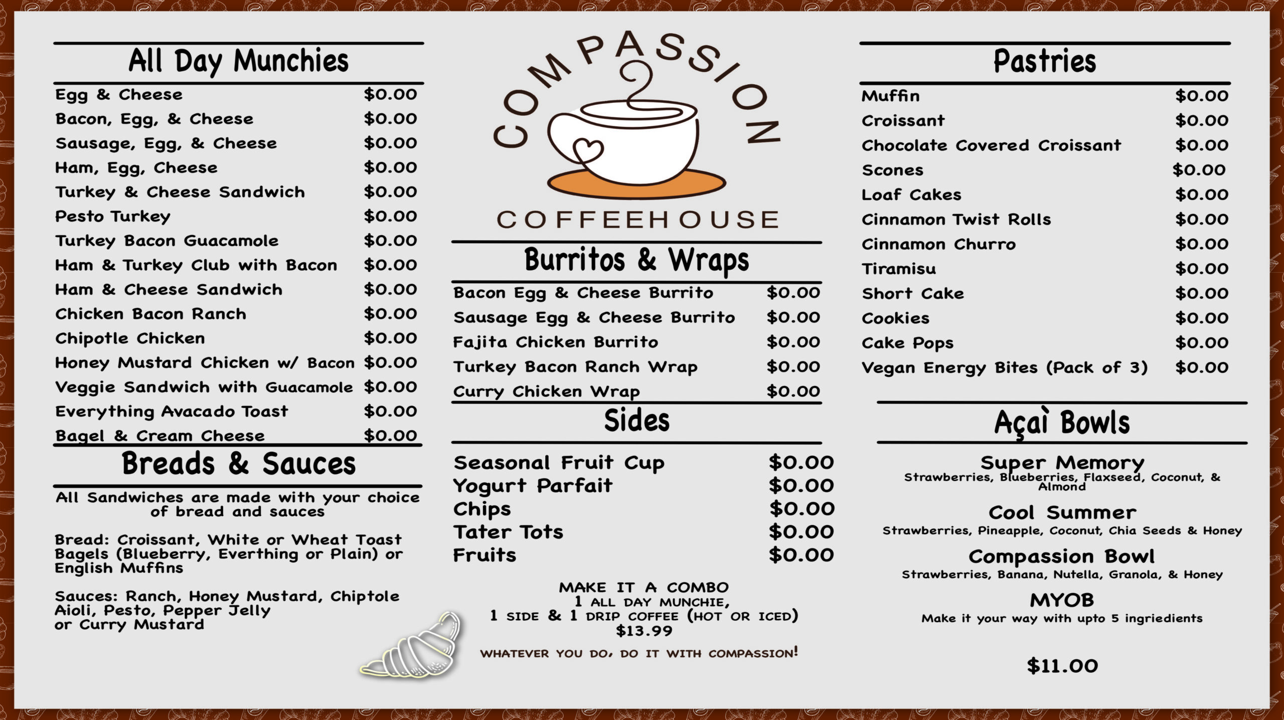 Compassion Coffeehouse offers a remarkable variety of premium beverages and food, catering to diverse tastes while ensuring high-quality options for all patrons.